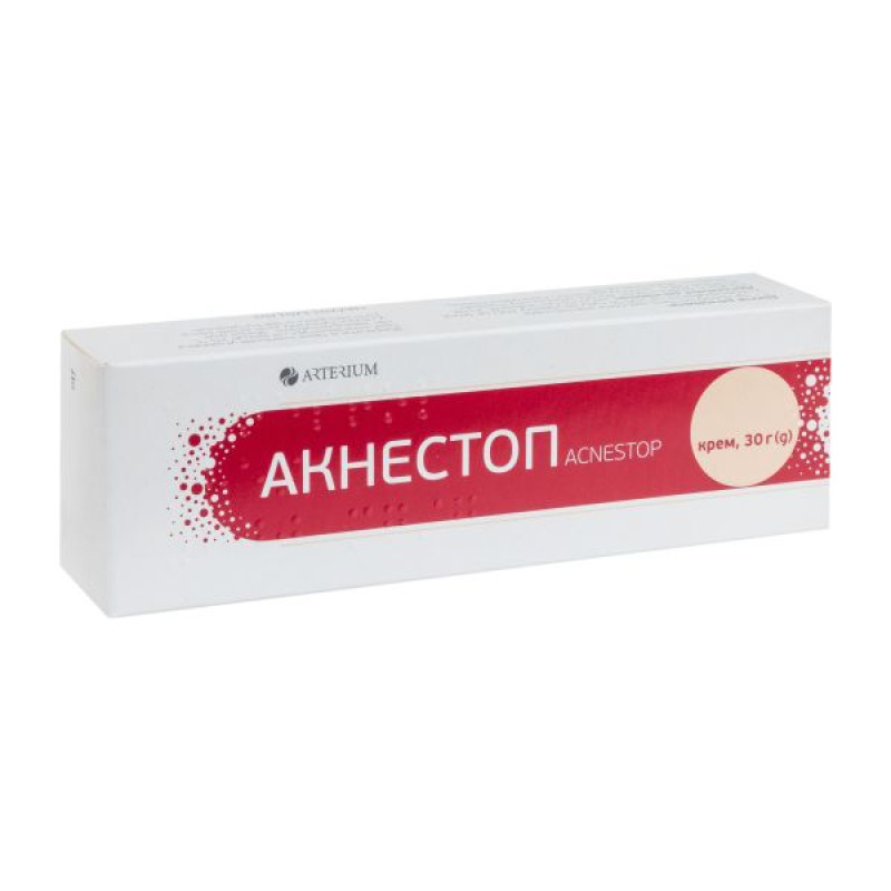 Вважається, що терапевтичну ефективність крему Акнестоп при лікуванні акне зумовлюють його антимікробна дія та безпосередній вплив на фолікулярний гіперкератоз.