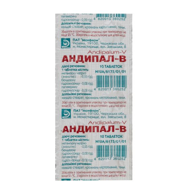 1 таблетка містить метамізолу натрію (анальгіну) 250 мг (0,25 г), бендазолу гідрохлориду 20 мг (0,02 г), папаверину гідрохлориду 20 мг (0,02 г);