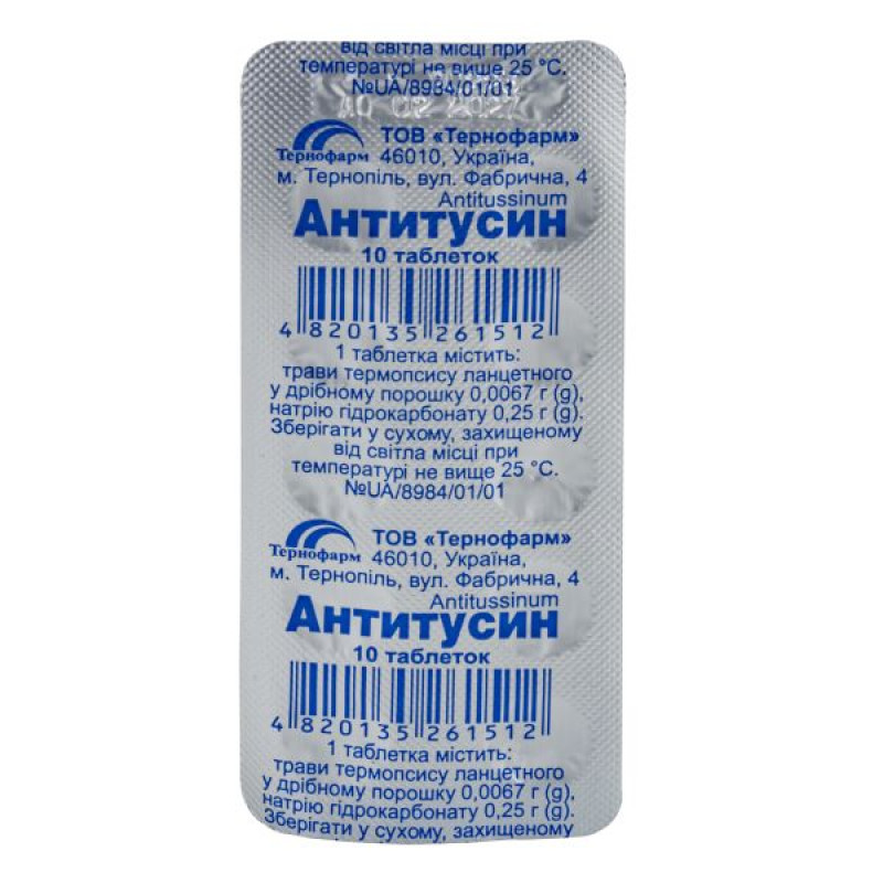 действующие вещества: 1 таблетка содержит: травы термопсиса ланцетного (Herba Thermopsidis lanceolata) в мелком порошке 0,0067 г, натрия гидрокарбоната 0,25 г;