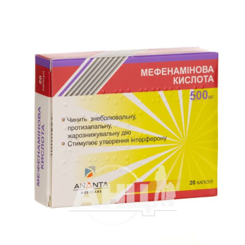 Со стороны органов зрения: нарушение зрения, обратимая потеря способности различать цвета, раздражение глаз. Со стороны органов слуха и вестибулярного аппарата: звон в ушах, оталгия. Со стороны респираторной системы, органов грудной клетки и средостения: диспноэ, бронхоспазм. Со стороны желудочно-кишечного тракта: боль в эпигастральной области, анорексия, изжога, тошнота, метеоризм, рвота, энтероколиты, колиты, обострение колита и болезни Крона, гастрит, гепатотоксичность, стеаторея, холестатическая желтуха, гепатит, панкреатит, гепаторенальный синдром, геморрагической гастрит, пептическая язва с кровотечением или без него. Желудочно-кишечные кровотечения, перфорация или желудочно-кишечное кровотечение, иногда с летальным исходом, особенно у пациентов пожилого возраста, диспепсия, запор, диарея. Со стороны почек и мочевыводящей системы: дизурия, цистит. Нарушение функции почек, альбуминурия, гематурия, олигурия или полиурия, почечная недостаточность, включая некроз сосочков, острый интерстициальный нефрит, нефротический синдром, аллергический гломерулонефрит, гипонатриемия, гиперкалиемия. Со стороны нервной системы: сонливость или бессонница, слабость, раздражительность, возбуждение, головная боль, затуманивание зрения, судороги, неврит зрительного нерва, парестезии, головокружение, ригидность затылочных мышц, лихорадка, потеря ориентации. Со стороны психики: спутанность сознания, депрессия, галлюцинации. Со стороны сердечно-сосудистой системы: артериальная гипертензия, аритмия, редко – застойная сердечная недостаточность, периферические отеки, обмороки, артериальная гипотензия, сердцебиение, одышка, тромботические осложнения (например инфаркт миокарда или инсульт). Со стороны крови и лимфатической системы: апластическая анемия, аутоиммунная гемолитическая анемия, удлинение времени кровотечения, эозинофилия, лейкопения, тромбоцитопения, снижение гематокрита, тромбоцитопеническая пурпура, агранулоцитоз, нейтропения, панцитопения, гипоплазия костного мозга. Со стороны иммунной системы: реакции гиперчувствительности, включая кожные высыпания, кожный зуд, отек лица, аллергический ринит, ангионевротический отек, отек гортани, синдром Стивенса-Джонсона, токсический эпидермальный некролиз, мультиформная эритема, крапивница, буллезный пемфигус, фоточувствительность, астма, анафилаксия. Со стороны кожи и подкожной клетчатки: пурпура, кожные высыпания, кожный зуд, мультиформная эритема, крапивница, буллезный пемфигус. Лабораторные показатели: нарушение толерантности к глюкозе у пациентов, больных сахарным диабетом, положительная реакция в некоторых тестах на наличие мефенаминовой кислоты и ее метаболитов в желчи и мочи. Повышение уровня печеночных ферментов в плазме крови.Взаимодействие
