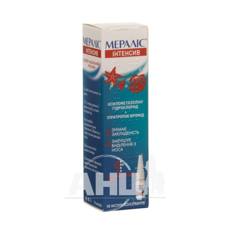 Количество лекарственного средства Мералис® Интенсив при 1 впрыскивании (примерно 140 мкл) содержит примерно 70 мкг ксилометазолина гидрохлорида и 84 мкг ипратропия бромида.