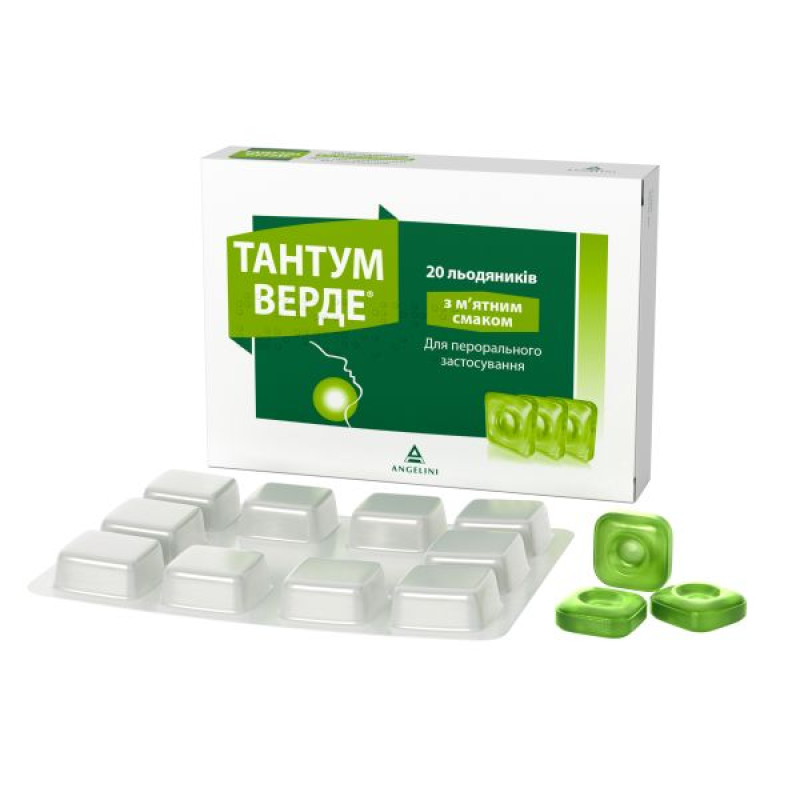Упаковка. Каждый леденец завернут в парафинированную бумагу с надписью "TANTUM VERDE", 10 леденцов формируют стик, который завернут в обертку из полиэтилена/бумаги/алюминиевой фольги. По 2 или 3 стика помещают в картонную пачку вместе с инструкцией по медицинскому применению.